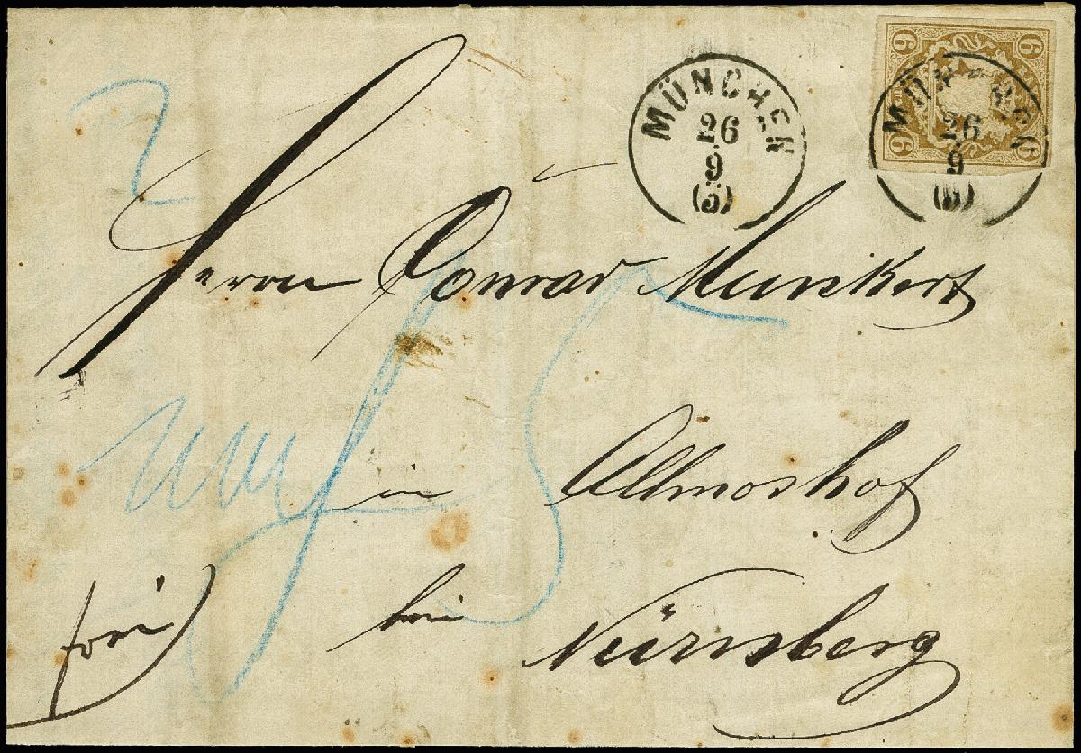 | Zusatzinformationen und Suchstichworte: | 368. Auktion Heinrich Köhler 26.-30. März 2019 Los 3334 6 Kr. ockerbraun, voll- bis breitrandig als alleinige Frankatur auf unterfrankierter Briefhülle der 2. Gewichtsstufe von "MÜNCHEN 26 9" (1869) nach Allmoshof bei Nürnberg, mit "noch 5" Kr. nachtaxiert; die Hülle etwas unfrisch und leicht fleckig; eine dennoch attraktive und interessante Frankatur, Fotoattest Brettl AIEP (2016) Zuschlag 460,00 EUR |