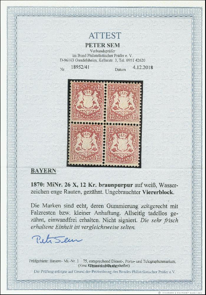 | Zusatzinformationen und Suchstichworte: | 368. Auktion Heinrich Köhler 26.-30. März 2019 Los 3336 1870, Gezähnte Ausgabe mit Wz.X: 12 Kr. dunkelbraunpurpur mit Wz. "enge Rauten" im 4er-Block, farbfrisch und einwandfrei gezähnt, ungebraucht mit Originalgummi, Kabinett, Fotoattest Sem BPP (2018) Zuschlag 400,00 EUR |