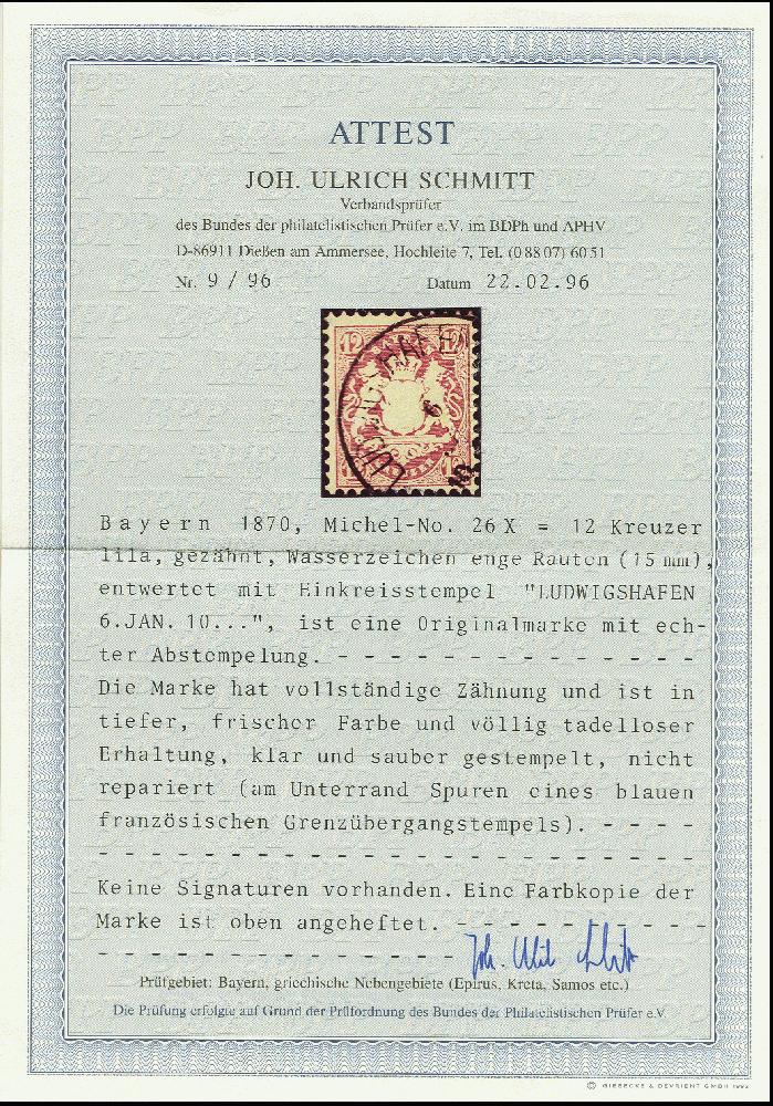 | Prüfer: | Schmitt, Joh. Ulrich (BPP (Bund Philatelistischer Prüfer)) |