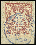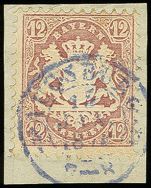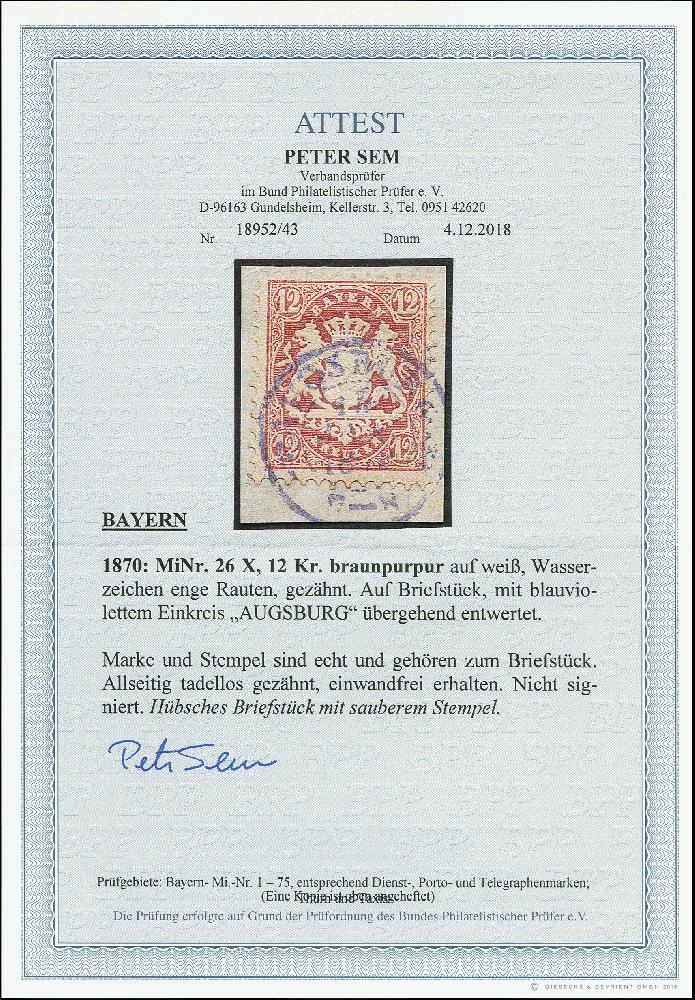 | Zusatzinformationen und Suchstichworte: | 368. Auktion Heinrich Köhler 26.-30. März 2019 Los 3339 12 Kr. braunpurpur, farbfrisch und tadellos gezähnt mit sauber aufgesetztem kleinen blauvioletten DKr. "AUGSBURG 15 JAN 187.." auf Briefstück, Kabinett, Fotoattest Sem BPP (2018) Zuschlag 260,00 EUR |
