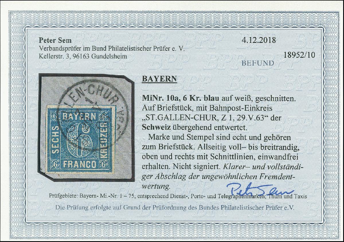 | Zusatzinformationen und Suchstichworte: | 368. Auktion Heinrich Köhler 26.-30. März 2019 Los 3362 "ST. GALLEN-CHUR Z 1 29.V.63", Schweizer Bahnpoststempel sauber auf Quadratausgabe 3 Kr. blau, voll- bis breitrandig auf Briefstück, Fotobefund Sem BPP Zuschlag 180,00 EUR |