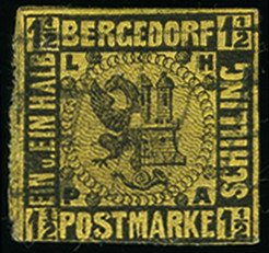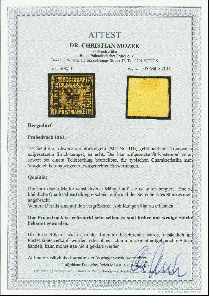 | Zusatzinformationen und Suchstichworte: | 368. Auktion Heinrich Köhler 26.-30. März 2019 Los 3367 1½ Sch. auf dunkelgelb, unten etwas berührt, sonst breitrandig und farbfrisch, sauber entwertet mit kreuzweise aufgesetztem Bergedorfer Strichstempel, unauffällige kleine Mängel, die jedoch aufgrund der Seltenheit des Stückes unerheblich sind. Wir haben nur 2 weitere gestempelte Exemplare dieses Probedruckes registriert, gestempelte Probedrucke anderer Wertstufen sind nicht bekannt; Fotoattest Dr. Mozek BPP (2010) Ausruf 3.000,00 EUR |