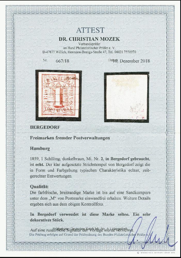 | Zusatzinformationen und Suchstichworte: | 368. Auktion Heinrich Köhler 26.-30. März 2019 Los 3373 Hamburg 1 Sch. geschnitten, allseits breitrandig und farbfrisch mit klar und sauber aufgesetztem Bergedorfer Strichstempel, sehr schönes Stück in tadelloser Erhaltung (winzige herstellungsbedingte Sandkornpore), sign. Grobe und Fotoattest Dr. Mozek BPP (2018) Zuschlag 320,00 EUR |
