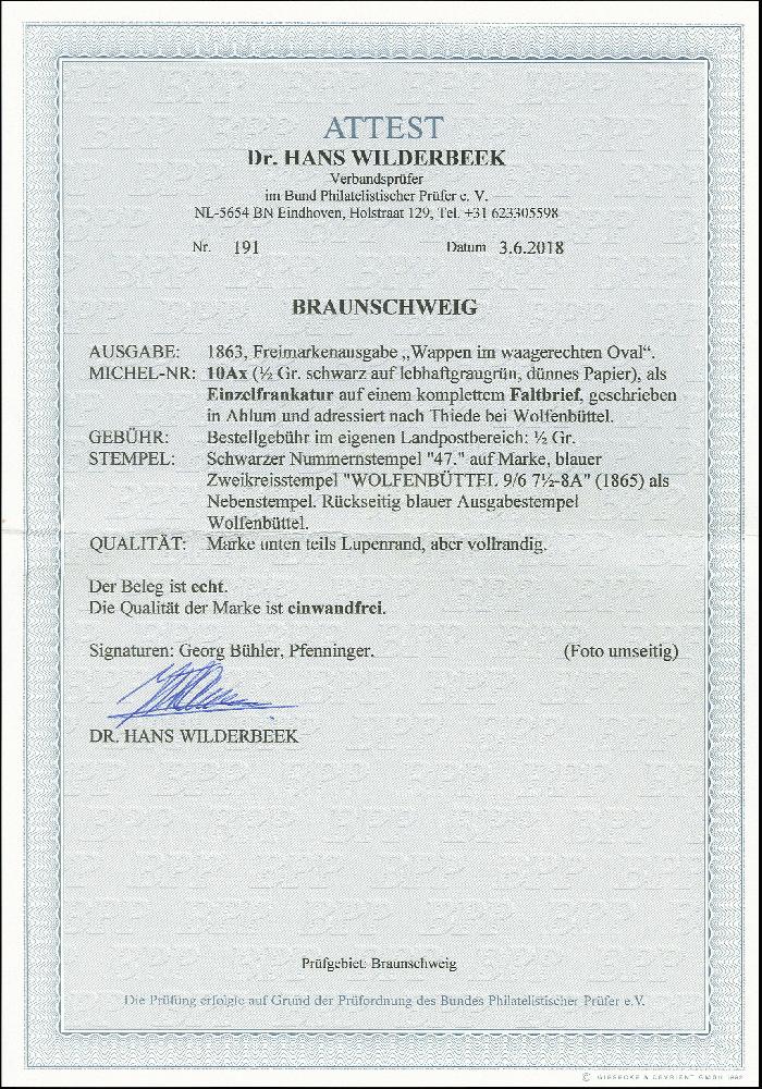 | Zusatzinformationen und Suchstichworte: | 368. Auktion Heinrich Köhler 26.-30. März 2019 Los 3379 ½ Gr. auf lebhaftgraugrün, dünnes Papier, unten noch voll- sonst voll- bis breitrandig und farbfrisch mit sauber aufgesetzter Nr. "47" und nebengesetztem DKr. "WOLFENBÜTTEL 9/6" (1865) auf kpl. Faltbrief nach Thiede im eigenen Landpostbereich. Eine sehr seltene Einzelfrankatur in einwandfreier Erhaltung, sign. Georg Bühler und Pfenninger sowie Fotoattest Dr. Wilderbeek BPP (2018) Zuschlag 320,00 EUR |