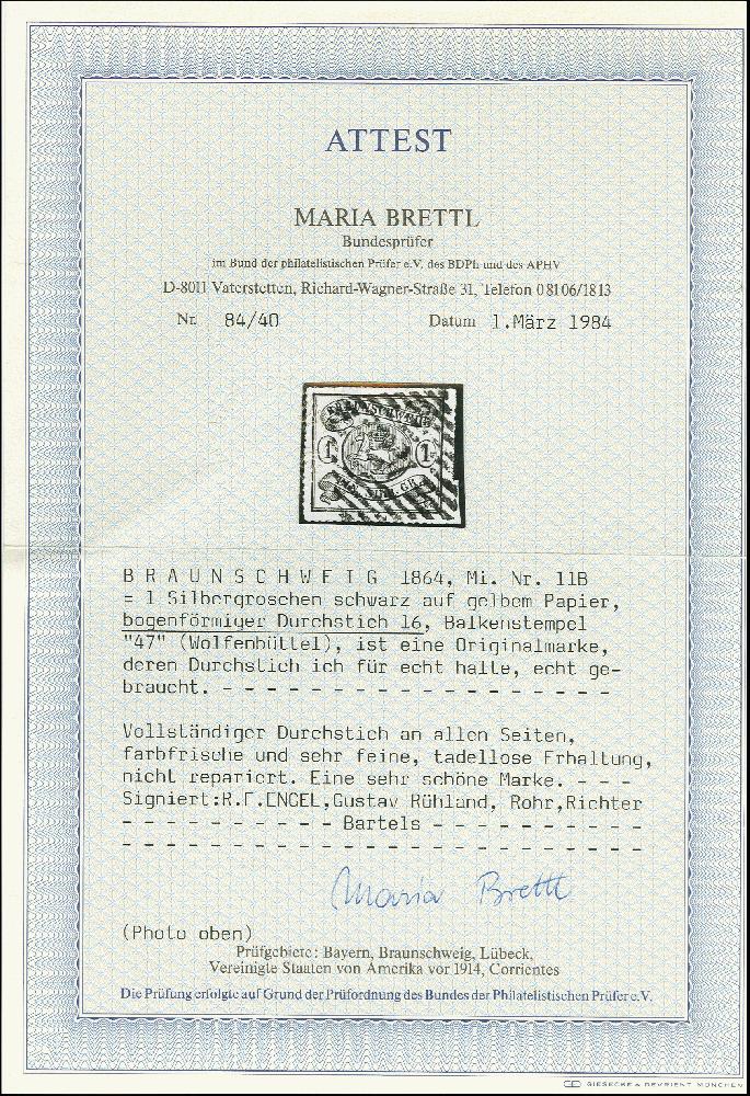 | Zusatzinformationen und Suchstichworte: | 368. Auktion Heinrich Köhler 26.-30. März 2019 Los 3383 1 Sgr. auf graugelb mit allseits vollständigem Versuchsdurchstich 16, sehr schön entwertet durch zentrische Nr. "47" WOLFENBÜTTEL, Kabinett, mehrfach sign. und Fotoattest Brettl BPP (1984) Zuschlag 600,00 EUR |