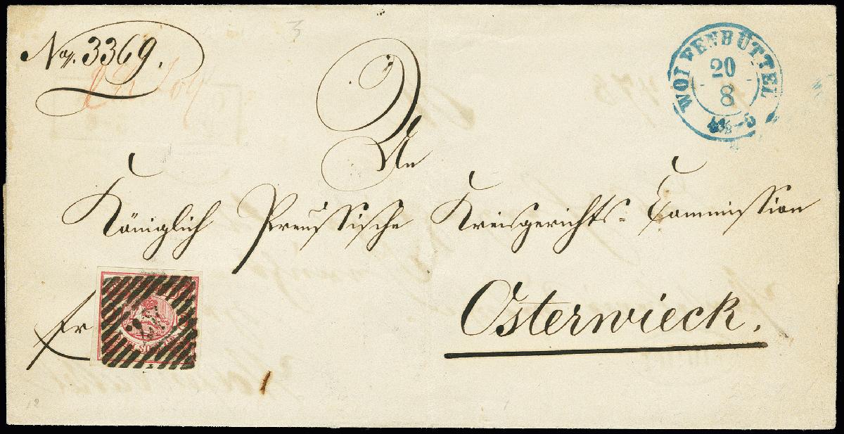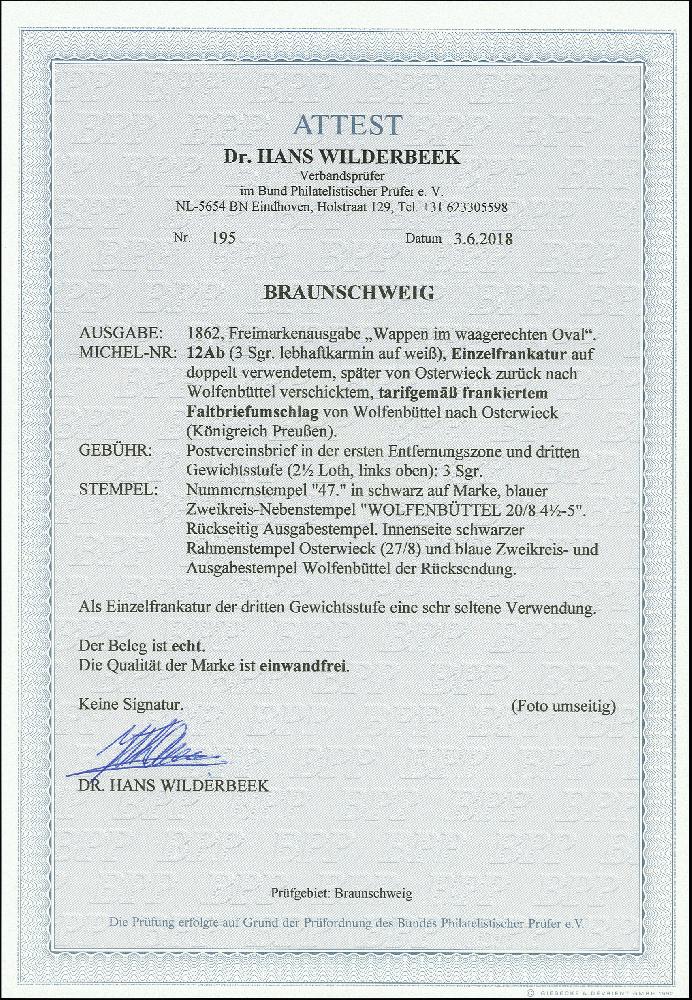 | Zusatzinformationen und Suchstichworte: | 368. Auktion Heinrich Köhler 26.-30. März 2019 Los 3385 3 Sgr. karmin, sehr schön farbfrisch und allseits breitrandig mit sauberer Nr. "47" auf Briefhülle der 3. Gewichtsstufe von "WOLFENBÜTTEL 20/8" nach Osterwieck mit Ausgabestempel; eine in dieser Form sehr seltene Einzelfrankatur, Fotoattest Dr. Wilderbeek BPP (2018) Zuschlag 550,00 EUR |