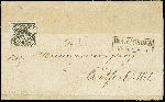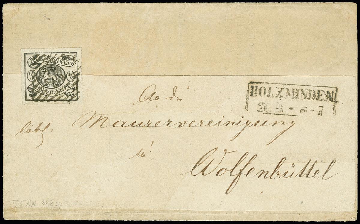 | Zusatzinformationen und Suchstichworte: | 368. Auktion Heinrich Köhler 26.-30. März 2019 Los 3386 1864, Durchstichausgabe 1/3 Sgr. schwarz mit allseits vollständigem Durchstich mit leicht aufgesetzter Nr. "24" und nebengesetztem Ra2 "HOLZMINDEN 26 6" (1865) auf fast vollständiger Streifbandsendung nach Wolfenbüttel mit rückseitigem Ausgabestempel; die Marke tadellos, das Streifband nicht ganz kpl., vorderseitig teils hinterlegt und Teile der Adresse nachgeschrieben, die Drucksache in den Faltungen teils etwas brüchig. Eine außerordentlich seltene Einzelfrankatur dieser Marke, außerhalb von Braunschweig verwendet haben wir nur ein weiteres Stück registriert, Fotoattest Lange BPP (2005) (Mi. 11.000,-) Ausruf 2.000,00 EUR |