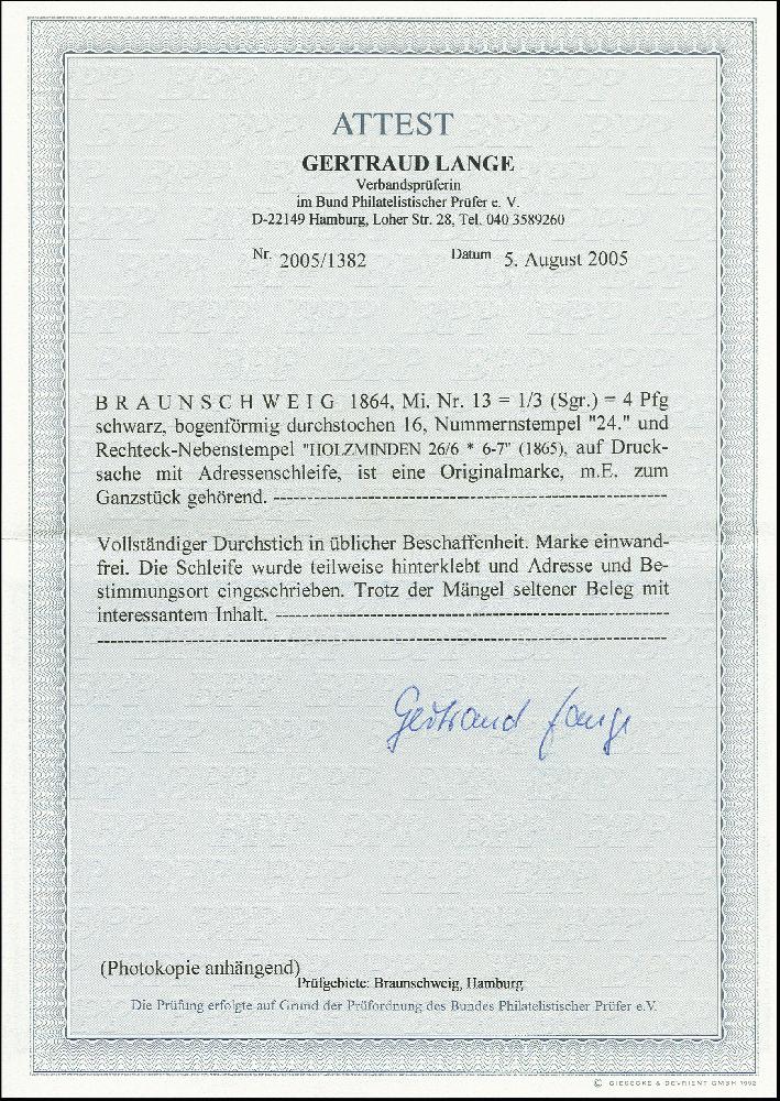 | Prüfer: | Lange, Gertraud (BPP (Bund Philatelistischer Prüfer)) |