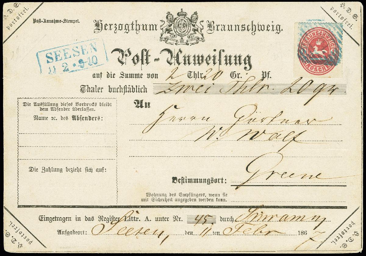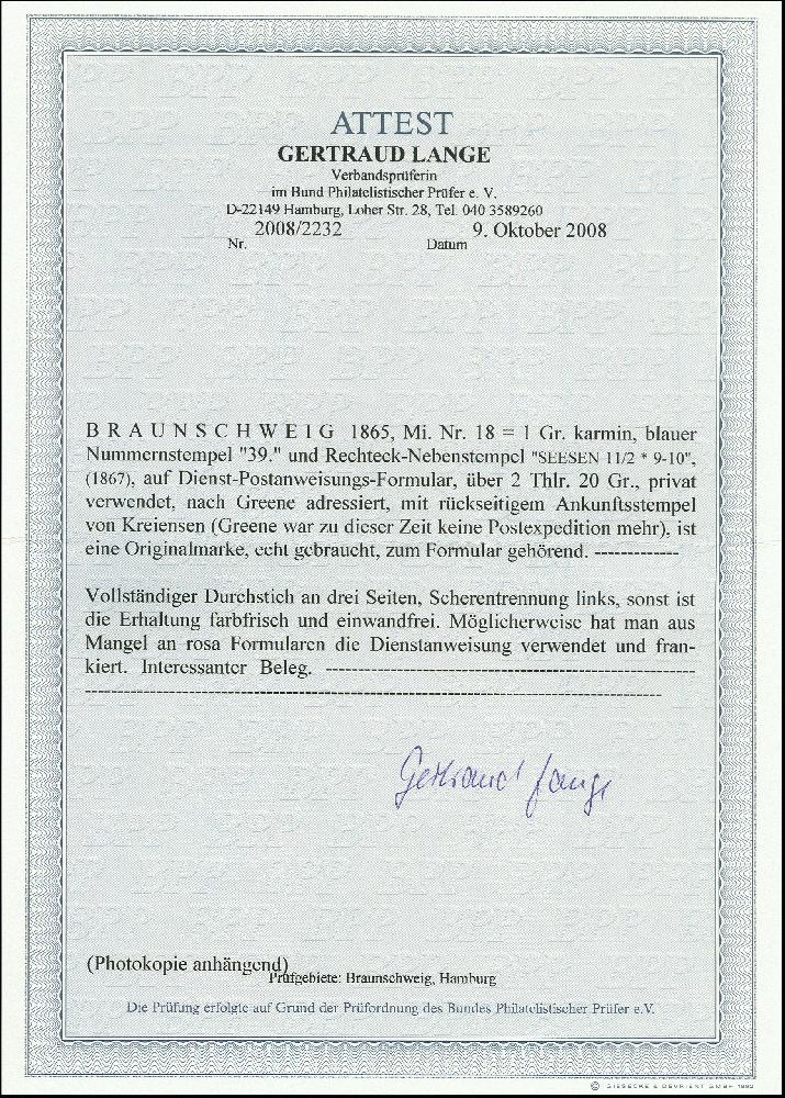 | Zusatzinformationen und Suchstichworte: | 368. Auktion Heinrich Köhler 26.-30. März 2019 Los 3390 1865, 1 Gr. rosa, links Scherentrennung sonst einwandfrei, mit blauer Nr. "39" und nebengesetztem Ra2 "SEESEN 11 2" (1867) auf Dienst-Postanweisung nach Greene; links kleiner Randriß, sonst einwandfrei; ein interessantes und seltenes Stück, möglicherweise wurde die Dienst-Postanweisung mangels normaler Postanweisungen benutzt; Fotoattest Lange BPP Ausruf 300,00 EUR |