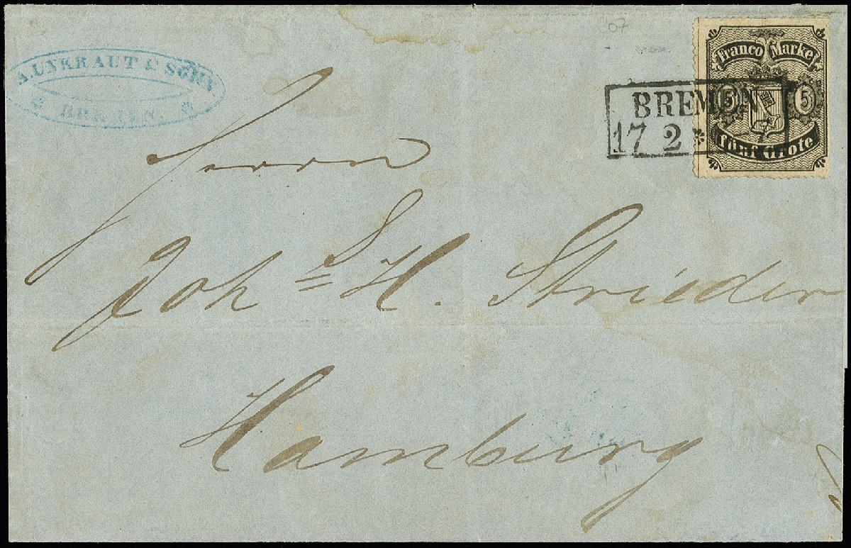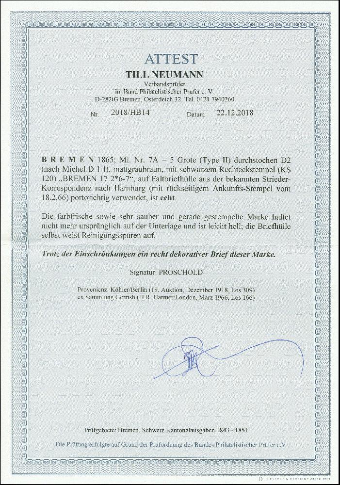 | Zusatzinformationen und Suchstichworte: | 368. Auktion Heinrich Köhler 26.-30. März 2019 Los 3398 1862, 5 Gr. auf mattgraubraun mit Durchstich D1I, farbfrisch und gut durchstochen mit sauber aufgesetztem Ra2 "BREMEN 17 2" (1866) auf Briefhülle der bekannten Strieder-Korrespondenz nach Hamburg; die Marke nicht mehr ursprünglich haftend und leicht hell; ein attraktiver Brief, sign. Pröschold und Fotoattest Neumann BPP (2018) Zuschlag 550,00 EUR |