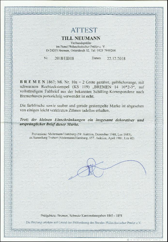 | Zusatzinformationen und Suchstichworte: | 368. Auktion Heinrich Köhler 26.-30. März 2019 Los 3401 1866/67, Gezähnte Ausgabe 2 Gr. gelblichorange, farbfrisch und bis auf einige leicht verkürzte Zähne tadellos erhalten, mit sauber aufgesetztem Ra2 "BREMEN 14 10" (1867) auf kpl. Faltbrief nach Bremerhaven mit rückseitigem Ankunftsstempel. Ein attraktiver Brief in sehr guter Erhaltung; Fotoattest Neumann BPP (2018) Zuschlag 360,00 EUR |