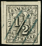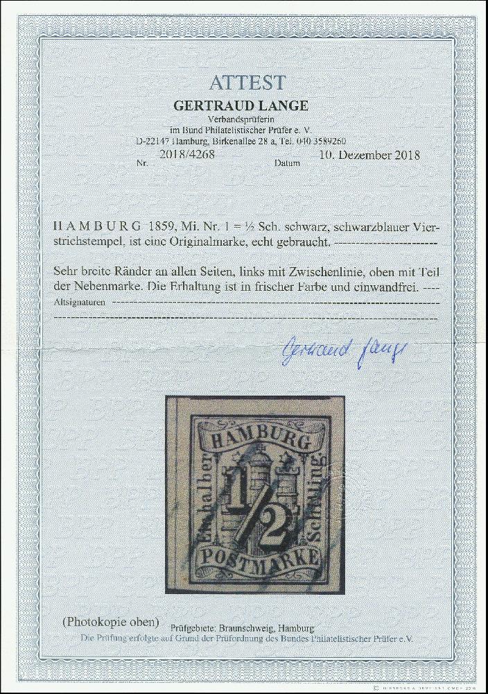 | Zusatzinformationen und Suchstichworte: | 368. Auktion Heinrich Köhler 26.-30. März 2019 Los 3403 1859, 1. Ausgabe ½ Sch. schwarz, allseits breit- bis überrandig, oben mit Teil der Nebenmarke und links mit Zwischenlinie, sauber entwertet durch schwarzblauen Strichstempel, Luxus, Fotoattest Lange BPP (2018) Zuschlag 400,00 EUR |