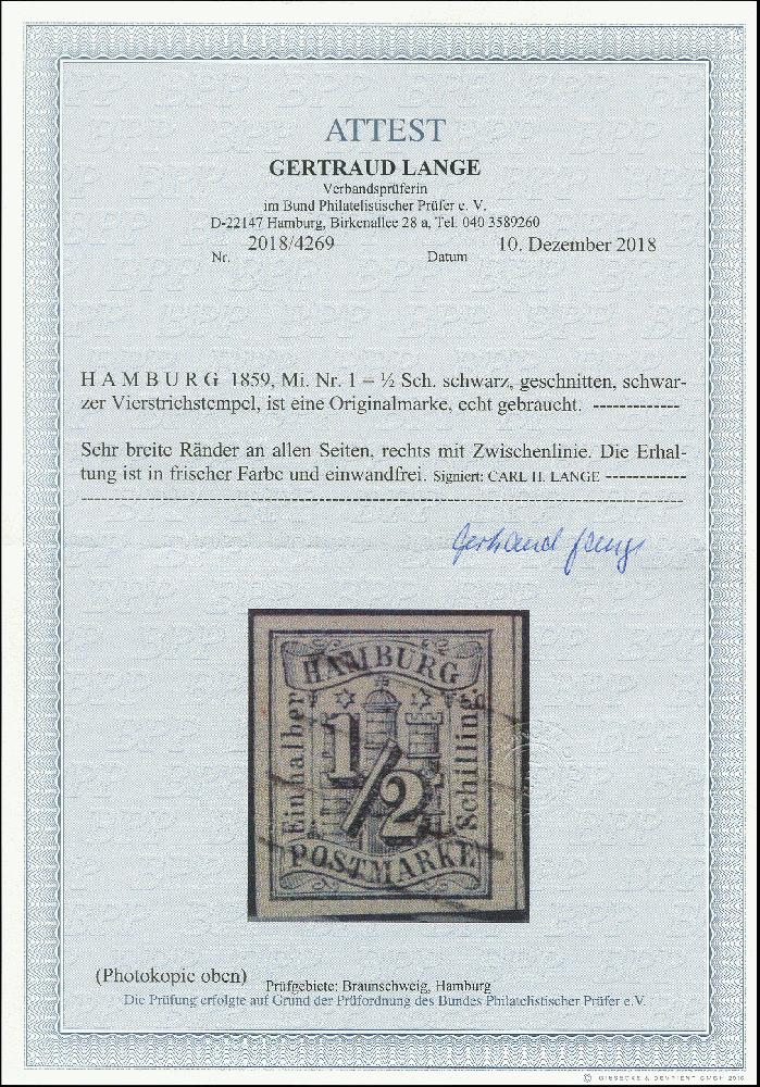 | Zusatzinformationen und Suchstichworte: | 368. Auktion Heinrich Köhler 26.-30. März 2019 Los 3404 ½ Sch. schwarz, allseits breit- bis überrandig mit zart aufgesetzem Strichstempel, tadellos, sign. Carl H. Lange und Fotoattest Lange BPP (2018) Zuschlag 380,00 EUR |