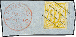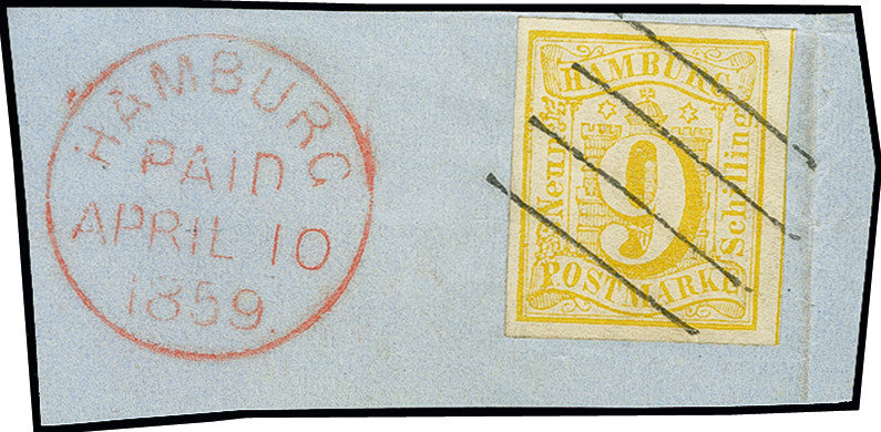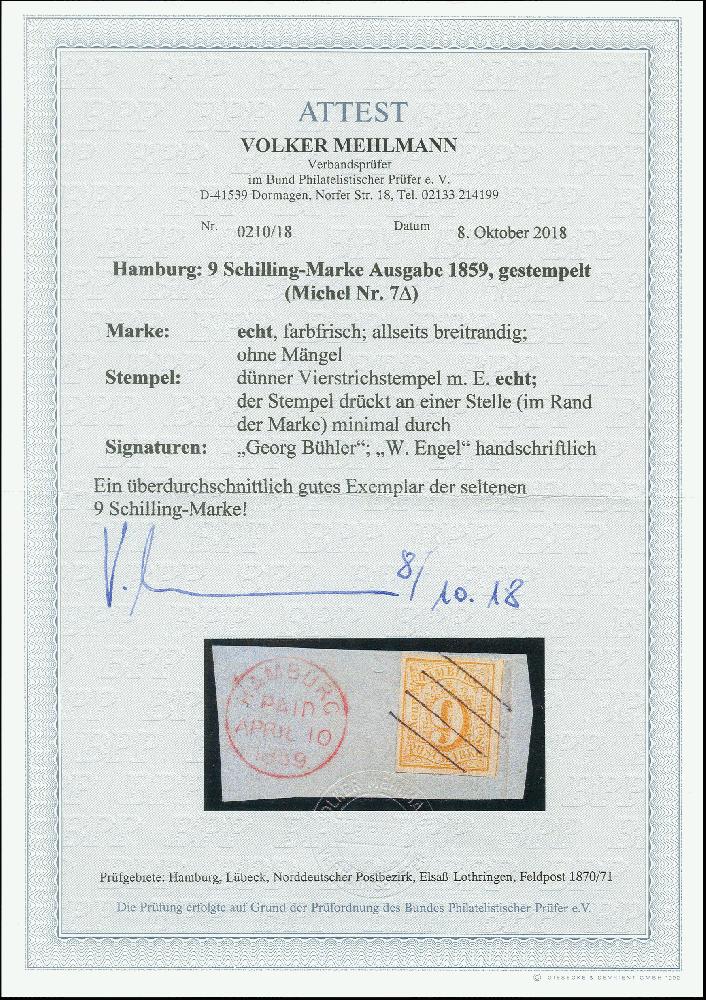 | Zusatzinformationen und Suchstichworte: | 368. Auktion Heinrich Köhler 26.-30. März 2019 Los 3409 9 Kr. orangegelb, farbfrisch und allseits breitrandig mit Trennlinie rechts und klarem, dünnen Vierstrichstempel auf Briefstück mit nebengesetztem rotem EKr. "HAMBURG PAID APRIL 10.1859", tadellos mit leichter Stempeldruckstelle im Rand, dekoratives Exemplar, sign. Bühler und W. Engel und Fotoattest Mehlmann BPP (2018) (Mi. 2.500,-) Zuschlag 1.400,00 EUR |