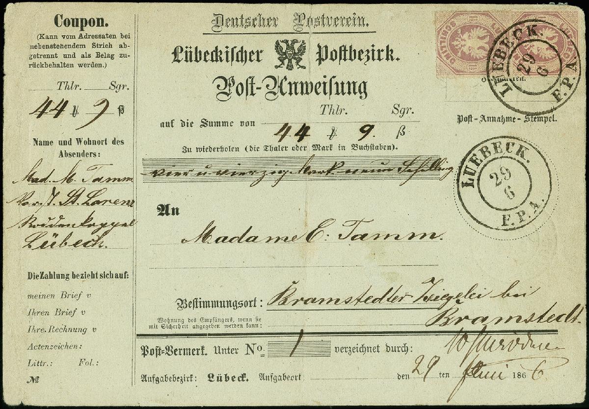 | Zusatzinformationen und Suchstichworte: | 368. Auktion Heinrich Köhler 26.-30. März 2019 Los 3423 1865, 1½ Sch. dunkelbraunpurpur, 2 Stück mit sauber auf- und nebengesetztem DKr. "LUEBECK F.P.A. 29 6" (1866) auf kpl. Postanweisung mit Coupon nach Bramstedt mit rückseitigem Ankunftsstempel und Auszahlungsvermerk; die links klebende Marke mit durchgehendem Eckriß, das Formular senkrecht gefaltet und oben etwas angetrennt, übliche Gebrauchsspuren; ein seltenes und durchaus attraktives Stück, Fotoattest Brettl BPP (1987) Ausruf 1.800,00 EUR |
