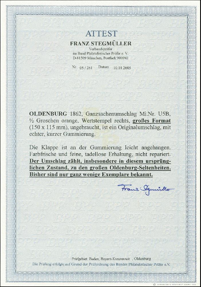 | Zusatzinformationen und Suchstichworte: | 368. Auktion Heinrich Köhler 26.-30. März 2019 Los 3435 1862, Wertstempel, Großformat ½ Gr. orange, ungebraucht, Klappe an der Gummierung leicht angehangen, sonst frische und für diesen Umschlag sehr gut Erhaltung; ein in dieser Erhaltung sehr seltenes Stück, private Signatur und Fotoattest Stegmüller BPP (2005) Zuschlag 270,00 EUR |