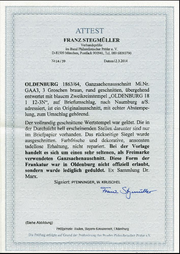 | Zusatzinformationen und Suchstichworte: | 368. Auktion Heinrich Köhler 26.-30. März 2019 Los 3437 Ganzsachenausschnitt 3 Gr. braun, vollrandig und geschnitten mit übergehendem blauen DKr. "OLDENBURG 18/1" nach Naumburg mit rückseitigem Ausgabestempel; der Wertstempel war zur Kontrolle gelöst, jedoch in der Durchsicht hell erscheinende Stellen sind nur im Briefpapier vorhanden. Ganzsachenausschnitte von Oldenburg sind sehr selten, von der 3 Gr. sind in der Köhler-Kartei nur 5 weitere auf Brief registriert, davon einer stark angeschnitten; sign. Pfenninger und Kruschel sowie Fotoatteste Brettl BPP (1988) und Stegmüller BPP (2014) Zuschlag 2.200,00 EUR |