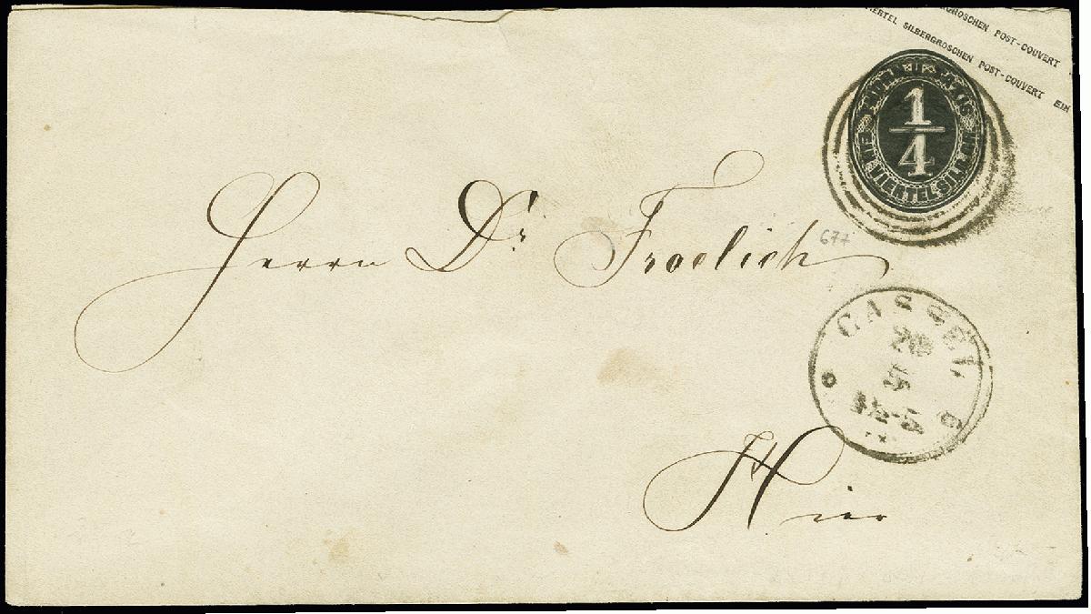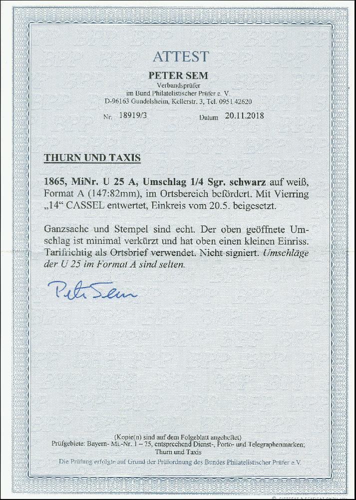 | Zusatzinformationen und Suchstichworte: | 368. Auktion Heinrich Köhler 26.-30. März 2019 Los 3477 1865, Umschlag 1/4 Sgr. schwarz im Format gebraucht mit Nummer "14" und nebengesetztem EKr. "CASSEL 20.5." als portogerechte Verwendung im Ortsverkehr, Umschlag oben minimal verkürzt und mit kleinem Öffnungsschnitt, sonst in guter Gesamterhaltung, selten, Fotoattest Sem BPP (2018) (Mi. 1.750,-) Ausruf 400,00 EUR |
