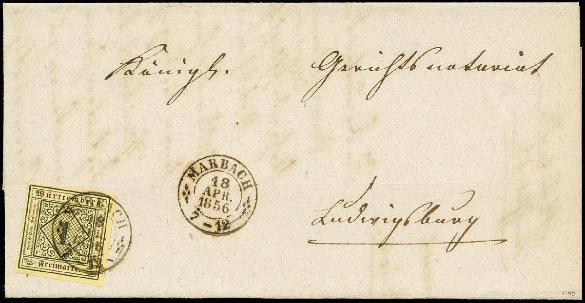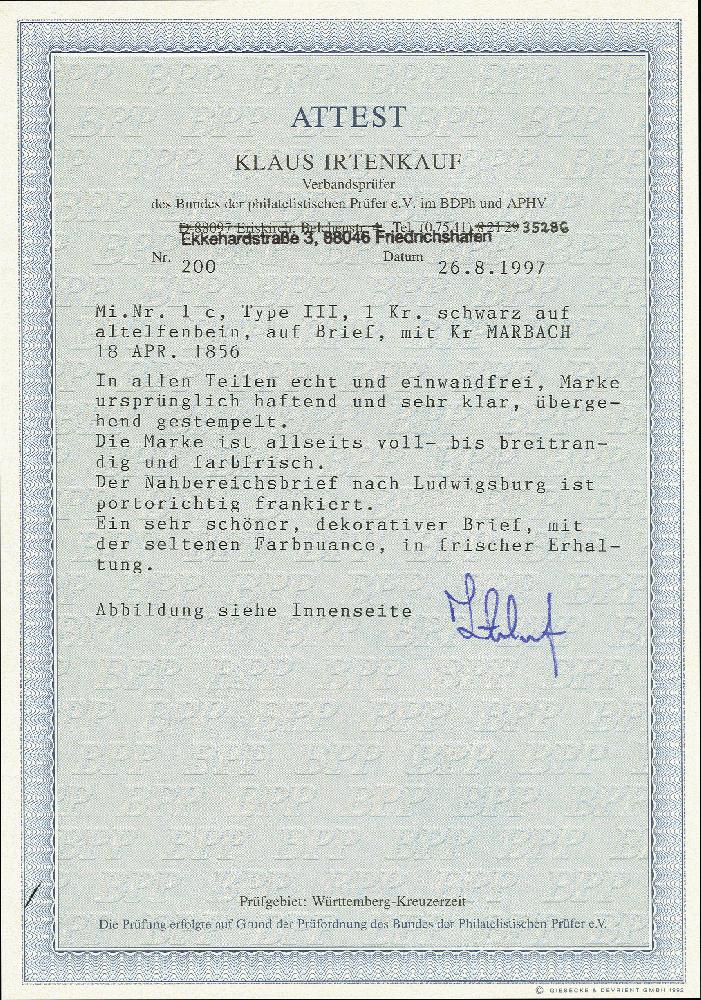 | Zusatzinformationen und Suchstichworte: | 368. Auktion Heinrich Köhler 26.-30. März 2019 Los 3483 1 Kr. auf altelfenbein, farbfrisch und gut voll- bis breitrandig mit klar auf- und nebengesetztem DKr. "MARBACH 18 APR. 1856" auf kpl. Faltbrief in den Nahbereich nach Ludwigsburg, Luxus, Fotoattest Irtenkauf BPP (1997) Zuschlag 360,00 EUR |
