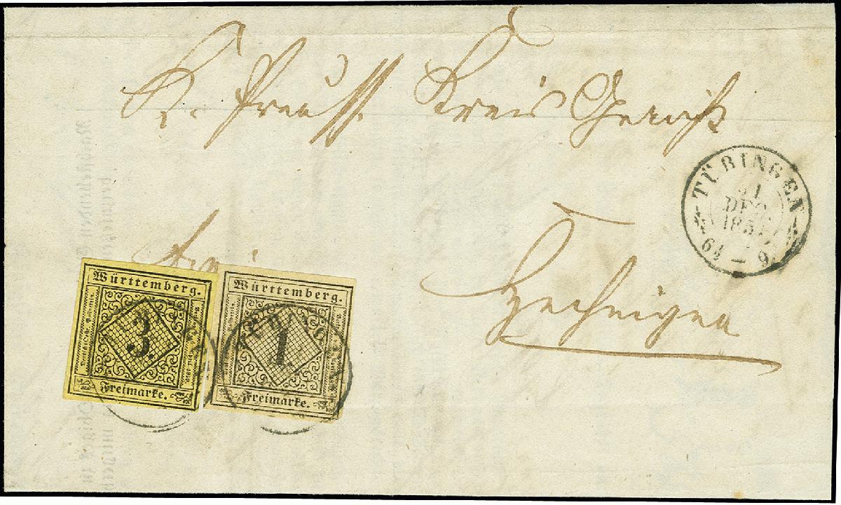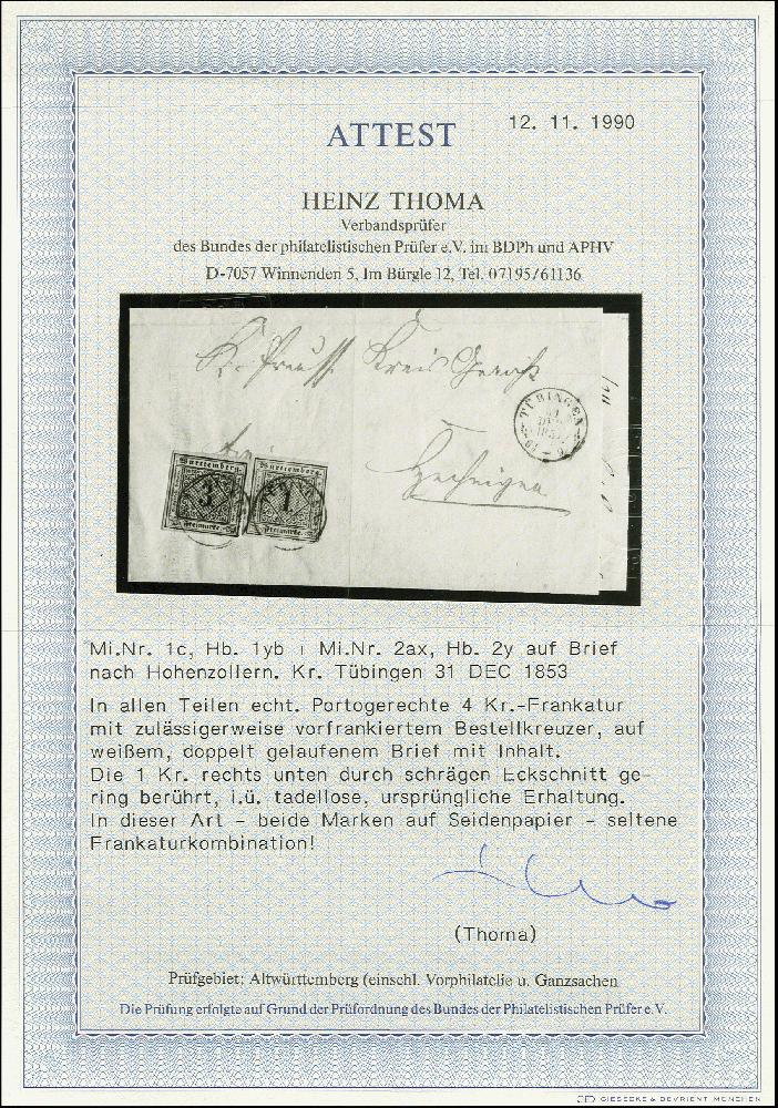 | Zusatzinformationen und Suchstichworte: | 368. Auktion Heinrich Köhler 26.-30. März 2019 Los 3487 1 Kr. auf mittelgraugelbem Seidenpapier und 3 Kr. auf gelbem Seidenpapier, erstere in der rechten unteren Ecke winzig berührt, sonst beide voll- bis breitrandig und farbfrisch mit leicht auf- und nebengesetztem DKr. "TÜBINGEN 31 DEC. 1853" auf doppelt verwendetem Faltbrief nach Hechingen; seltenes Hohenzollern-Porto mit vorausfrankiertem Bestellgeld in schöner Erhaltung und mit beiden Werten auf Seidenpapier ganz ungewöhnlich, Fotoattest Thoma BPP (1990) Zuschlag 1.500,00 EUR |