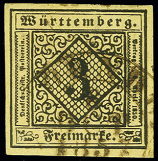 | Zusatzinformationen und Suchstichworte: | 368. Auktion Heinrich Köhler 26.-30. März 2019 Los 3490 3 Kr. auf schwefelgelb, allseits gleichmäßig breitrandig geschnitten, sauber entwertet durch Steigbügelstempel "SCHORNDORF 28 OCT. 1857", tadelloses Stück der seltenen Farbe, sign. Heinrich BPP mit Fotobefund (1999) Zuschlag 380,00 EUR |