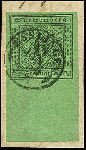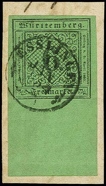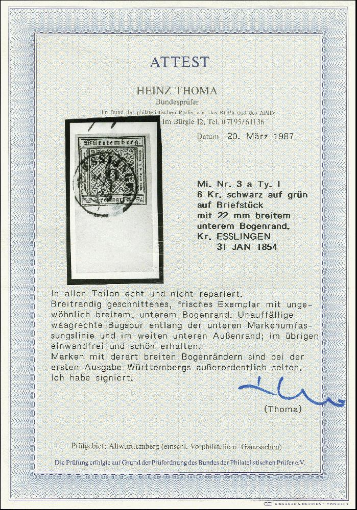 | Zusatzinformationen und Suchstichworte: | 368. Auktion Heinrich Köhler 26.-30. März 2019 Los 3495 6 Kr. auf grün, Type I, allseits breitrandig geschnittenes Unterrandstück mit 22 mm Bogenrand, sehr schön farbfrisch, mit sauber aufgesetztem DKr. "ESSLINGEN 31 JAN 1854" auf Briefstück; waagerechte Bugspur entlang der unteren Randlinie sowie eine weitere ganz schwache im unteren Bogenrand. Ein sensationelles Stück in insgesamt sehr schöner Erhaltung, Fotoattest Thoma BPP (1987) Zuschlag 3.000,00 EUR |