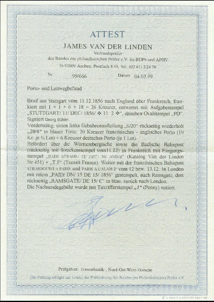 | Zusatzinformationen und Suchstichworte: | 368. Auktion Heinrich Köhler 26.-30. März 2019 Los 3503 18 Kr. auf bläulichviolett, Type II, mit 6 Kr. auf blaugrün, Type III und 2 Einzelwerten 1 Kr. auf hellsämisch, Type III, als Streifen geklebt, die 18 Kr. an 2 Stellen rechts leicht berührt und leichte Randschürfung, sonst alle voll- bis breitrandig und farbfrisch, teils leicht knittrig bzw. kleinere Randmängel, mit DKr. "STUTTGART 11 DEC. 1856" auf Briefhülle über Frankreich an Lady Montefiori in London, nachgesandt nach Ramsgate und wieder nachgesandt nach London mit diversen Stempeln vorder- und rückseitig. Das Porto setzt sich zusammen aus 6 Kr. deutschem Porto und 20 Kr. Weiterfranko. Eine attraktive Dreifarbenfrankatur mit interessanter Adresse, Fotoatteste Thoma BPP (1998) und Van der Linden BPP (1999) Zuschlag 2.800,00 EUR |