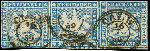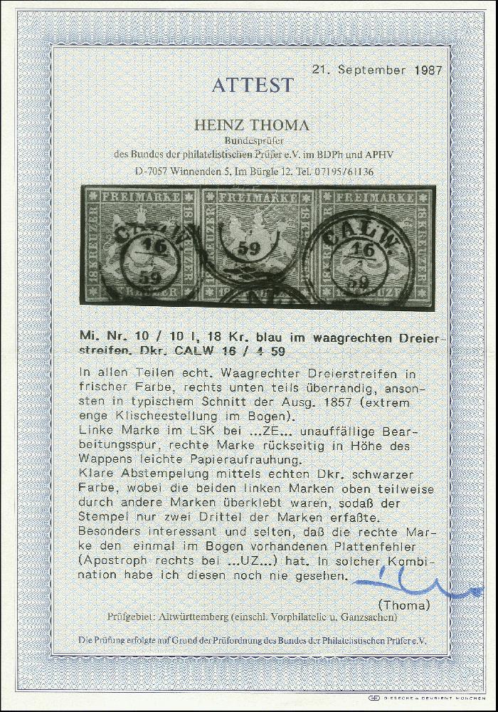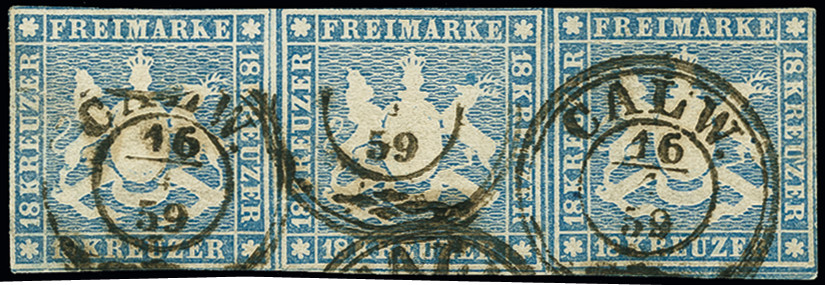 | Zusatzinformationen und Suchstichworte: | 368. Auktion Heinrich Köhler 26.-30. März 2019 Los 3511 18 Kr. hellblau im waagerechten 3er-Streifen, dabei der rechte Wert mit Plattenfehler "Strich rechts am U", ausgabentypisch geschnitten, rechts unten überrandig, sauber entwertet durch Kr. "CALW 16/4 59" (durch ehemals Überklebung durch andere Marken teils unvollständig); die linke Marke unauffällige Bearbeitungsspur im linken Schriftband, der rechte Wert rückseitig kleine Aufrauhung; insgesamt ein attraktiver und sehr seltener Streifen, Pendant zum 3er-Streifen aus der Romanow-Sammlung, der ursprünglich unter diesem Streifen klebte. Fotoattest Thoma BPP (1987) Ausruf 3.000,00 EUR |