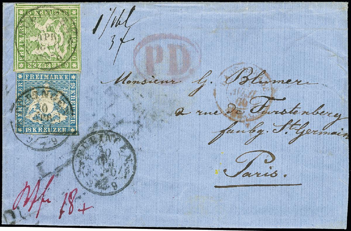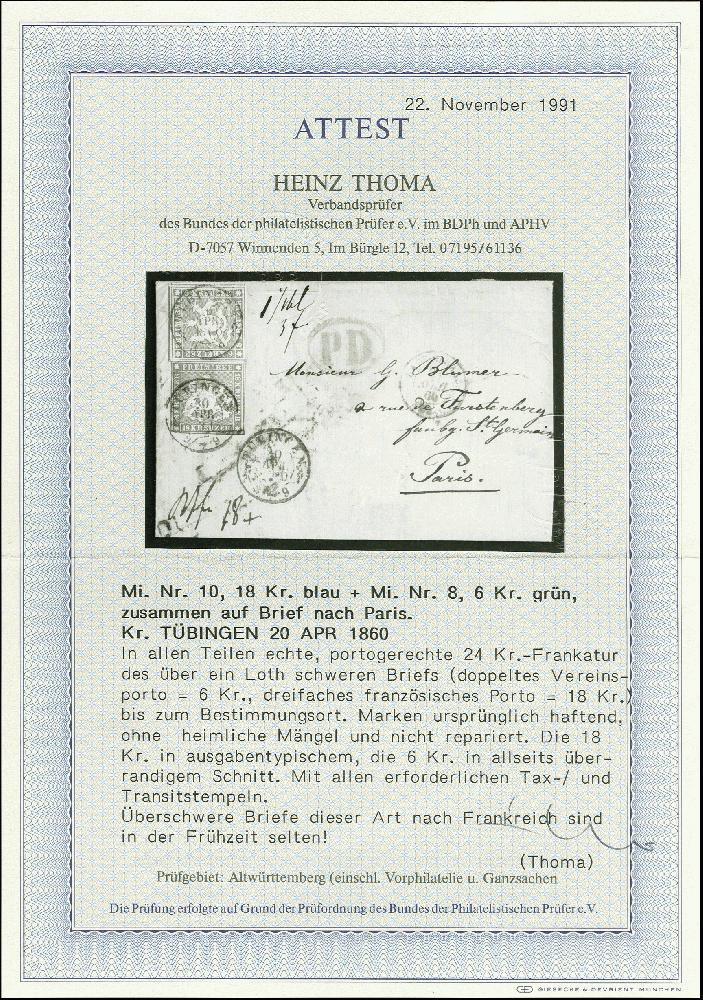 | Zusatzinformationen und Suchstichworte: | 368. Auktion Heinrich Köhler 26.-30. März 2019 Los 3512 18 Kr. hellblau in ausgabetypischem Schnitt, lediglich links unten minimal berührt, zusammen mit überrandiger 6 Kr. grün auf Briefhülle der 2. deutschen und 3. französischen Gewichtsstufe von "TÜBINGEN 20 APR. 1860" nach Paris, eine seltene 24 Kreuzer-Frankatur, Fotoattest Thoma BPP (1991) Zuschlag 2.200,00 EUR |