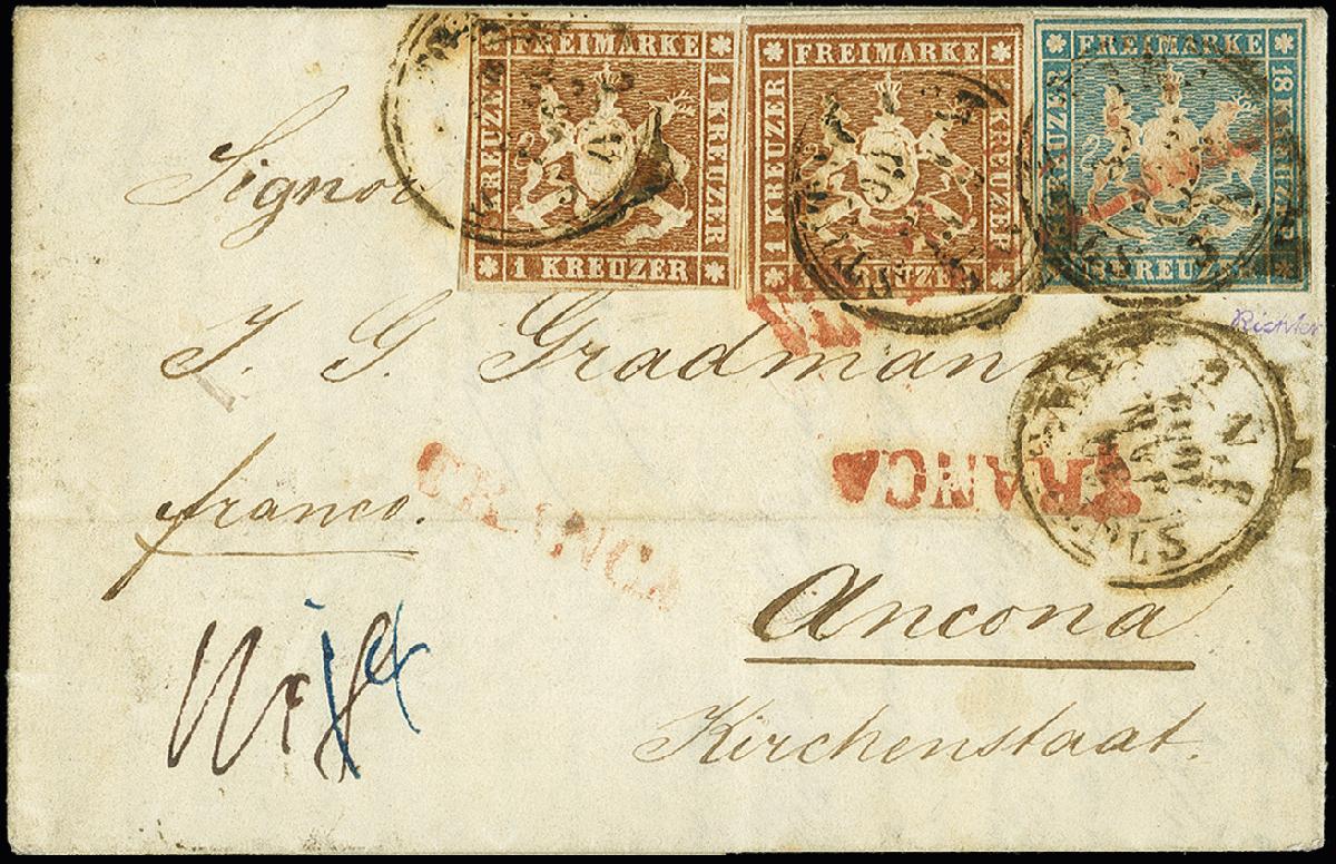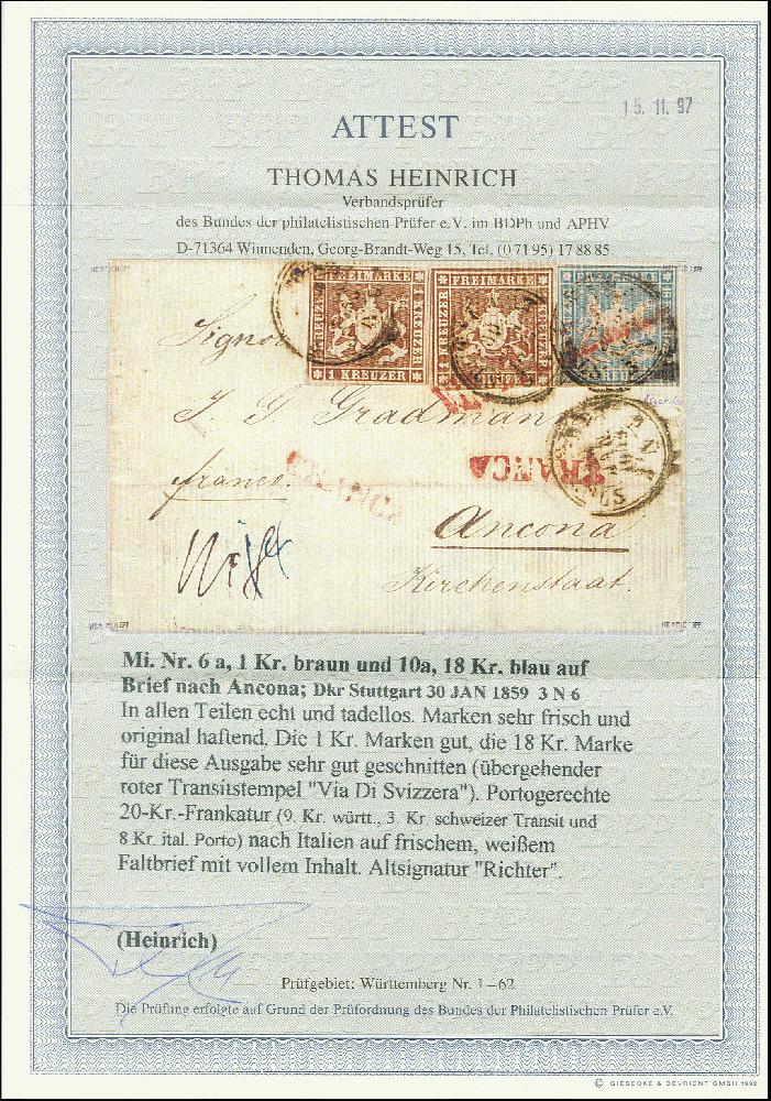 | Zusatzinformationen und Suchstichworte: | 368. Auktion Heinrich Köhler 26.-30. März 2019 Los 3513 18 Kr. hellblau mit 2 Stück 1 Kr. braun, alle gut, die 18 Kr. für diese Ausgabe sehr gut geschnitten, mit Kr. "STUTTGART 30 JAN 1859" und teils übergehendem roten "VIA DI SVIZZERA" auf kpl. kleinem Faltbrief nach Ancona im Kirchenstaat mit ausgewiesenem Weiterfranko von 11 Kr., davon 3 Kr. Schweizer Transit und 8 Kr. italienisches Porto; ein attraktiver und recht seltener Auslandsbrief in sehr schöner Erhaltung, sign. Richter und Fotoattest Heinrich BPP (1997) Zuschlag 4.200,00 EUR |