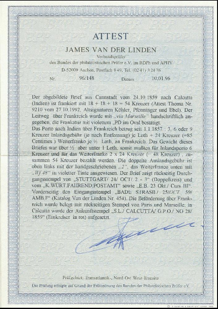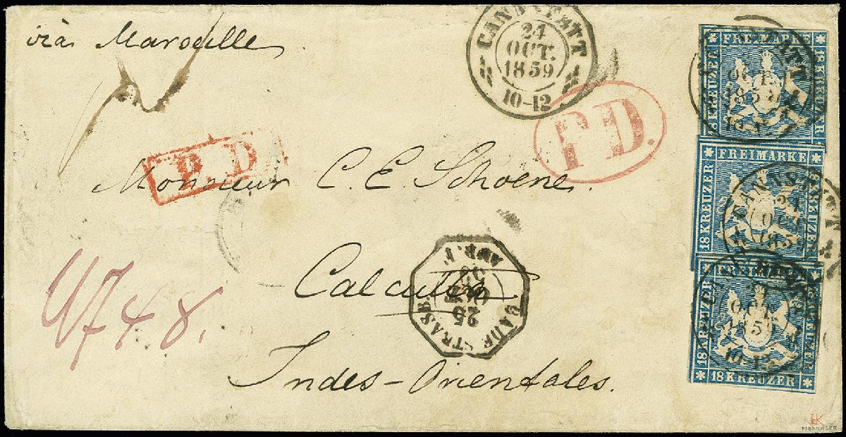 | Zusatzinformationen und Suchstichworte: | 368. Auktion Heinrich Köhler 26.-30. März 2019 Los 3514 18 Kr. tiefblau, 3 Einzelwerte in ausgabetypischem Schnitt, teils überrandig, farbfrisch und mit guter Prägung, mit sauber auf- und nebengesetztem DKr. "CANNSTATT 24 OCT. 1859" auf Briefkuvert der 2. französischen Gewichtsstufe über Frankreich nach Kalkutta, Indien mit vorderseitig vermerktem Weiterfranko von 48 Kr. Eine attraktive und seltene Mehrfachfrankatur mit seltener Destination, sign. Köhler und Pfenninger sowie Fotoatteste Thoma BPP (1992) und Van der Linden BPP (1996) Zuschlag 6.500,00 EUR |