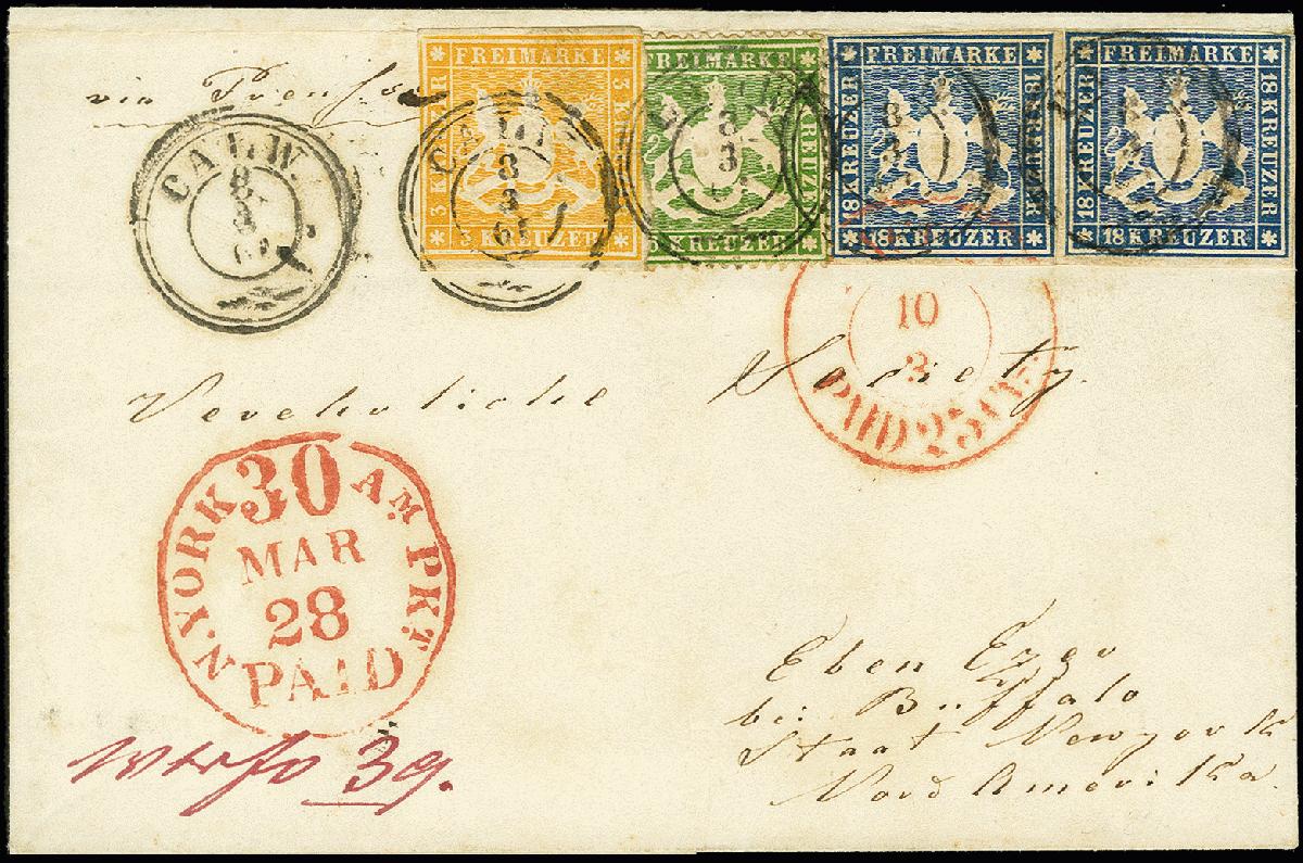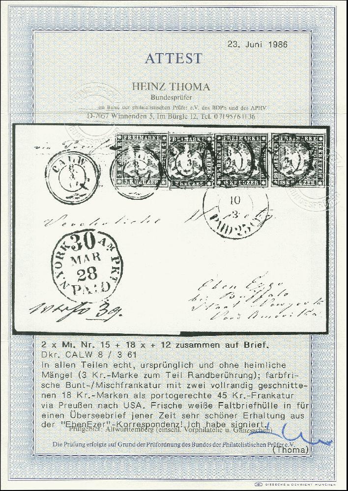 | Zusatzinformationen und Suchstichworte: | 368. Auktion Heinrich Köhler 26.-30. März 2019 Los 3517 18 Kr. blau, 2 Einzelwerte, beide voll- bis breitrandig zusammen mit etwas berührter 3 Kr. orange (rechts gerissen statt geschnitten) in Mischfrankatur mit 1860, 6 Kr. grün, alle farbfrisch, als Streifen geklebt mit Kr. "CALW 8 3 61" auf Briefhülle über die Prussian Closed Mail und New York nach Eben Ezer im Staate New York; ein attraktiver und in dieser Form seltener Transatlantik-Brief, Fotoattest Thoma BPP (1986) Zuschlag 5.200,00 EUR |