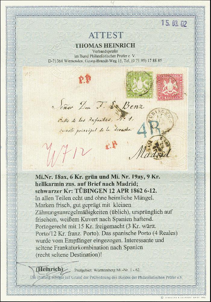 | Zusatzinformationen und Suchstichworte: | 368. Auktion Heinrich Köhler 26.-30. März 2019 Los 3518 6 Kr. grün in Mischfrankatur mit dünnem Papier 9 Kr. hellkarmin, beide farbfrisch und gut geprägt mit üblichen kleinen Zähnungsunregelmäßigkeiten auf Briefkuvert von "TÜBINGEN 12 APR. 1862" nach Madrid, befördert im geschlossenen Briefpaket über Frankreich, für das dortige Inlandsporto mit "4 R" taxiert; eine seltene frühe Auslandsfrankatur, Fotoattest Heinrich BPP (2002) Zuschlag 800,00 EUR |