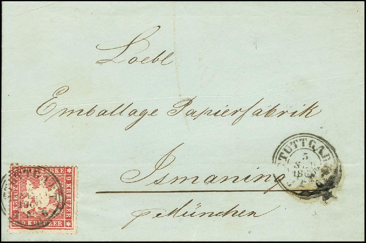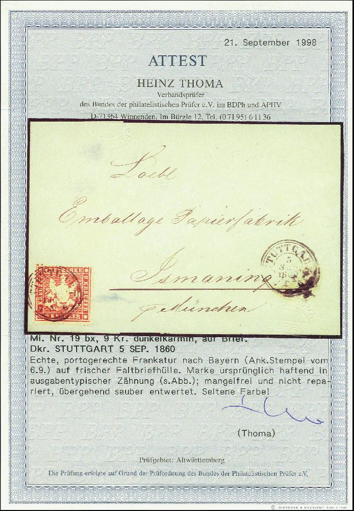 | Zusatzinformationen und Suchstichworte: | 368. Auktion Heinrich Köhler 26.-30. März 2019 Los 3520 9 Kr. dunkelkarmin, farbfrisch und mit guter ausgabetypischer Zähnung, mit auf- und nebengesetztem Kr. "STUTTGART 5 SEP 1860" auf Briefhülle nach Ismaning bei München; eine schöne Einzelfrankatur der seltenen Farbe, Fotoattest Thoma BPP (1998) Zuschlag 3.50,00 EUR |