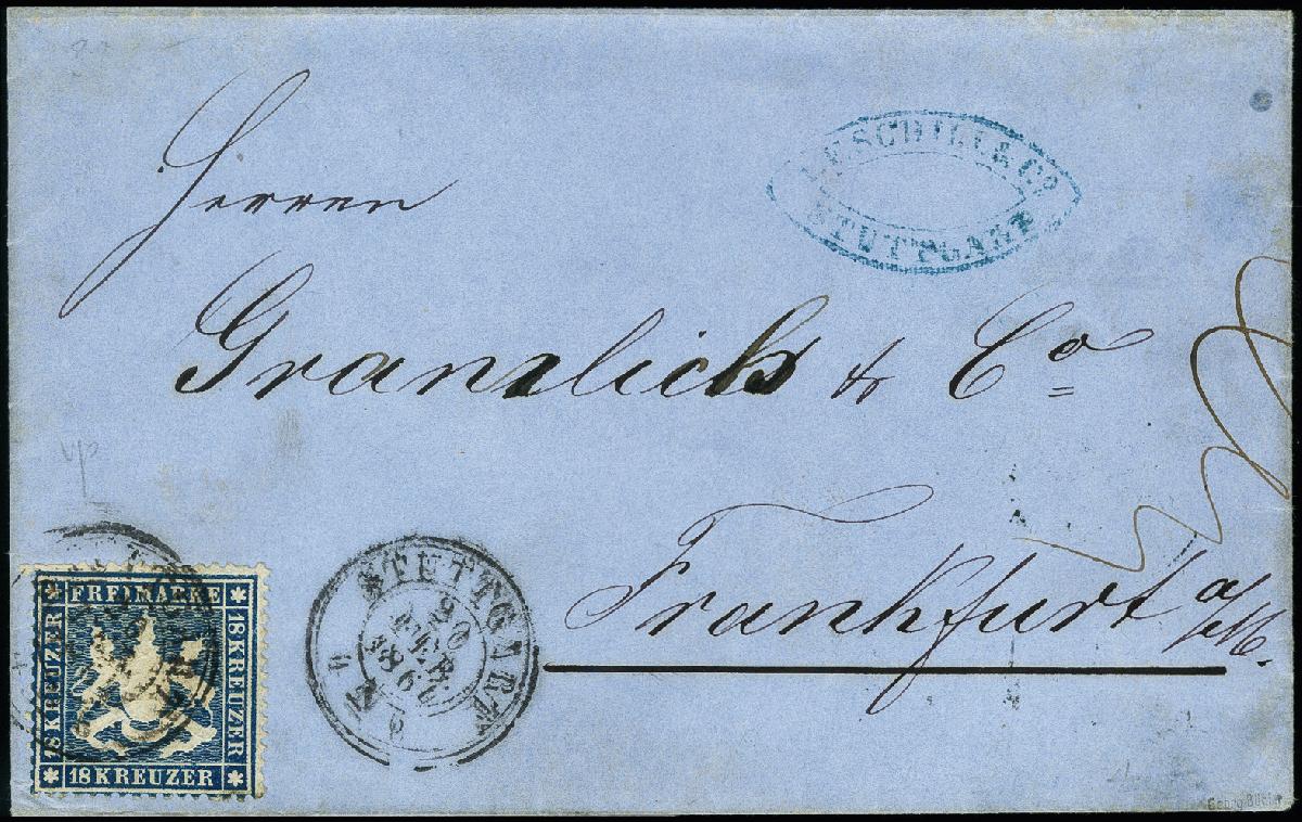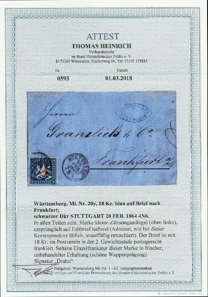 | Zusatzinformationen und Suchstichworte: | 368. Auktion Heinrich Köhler 26.-30. März 2019 Los 3524 1861, dünnes Papier, 18 Kr. blau, sehr schön farbfrisch und bis auf 3 kurze Zähne oben links einwandfrei gezähnt, ursprünglich haftend auf Briefhülle der 2. Gewichtsstufe von "STUTTGART 20 FEB. 1864" nach Frankfurt/M. mit rückseitigem Distributionsstempel; der Name in der Adresse wie bei dieser Korrepondenz üblich unauffällig retouchiert, sonst einwandfrei; eine seltene und attraktive Einzelfrankatur, sign. Drahn und Fotoattest Heinrich BPP (2018) Zuschlag 1.000,00 EUR |