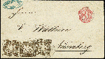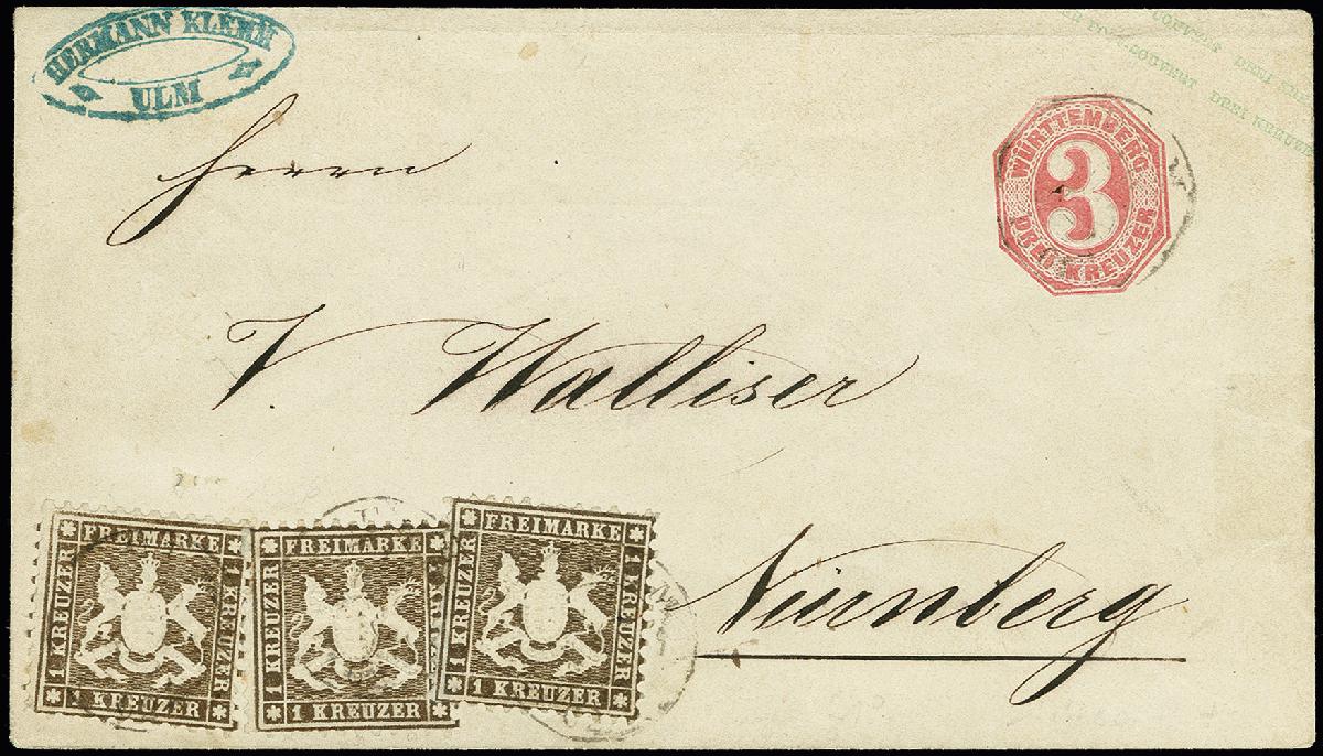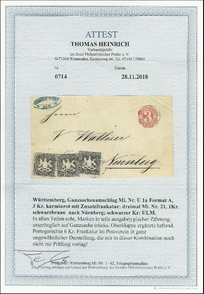 | Zusatzinformationen und Suchstichworte: | 368. Auktion Heinrich Köhler 26.-30. März 2019 Los 3526 1862, Weite Zähnung 1 Kr. schwarzbraun, 3 Einzelwerte in ausgabetypischer Zähnung als Zufrankatur auf Ganzsachenumschlag 3 Kr. rosa mit leicht aufgesetztem DKr. von Ulm nach Nürnberg, unterer Teil der Rückklappe ergänzt, sonst gute Erhaltung, eine sehr seltene und attraktive Frankaturkombination, Fotoattest Heinrich BPP (2018) Zuschlag 850,00 EUR |