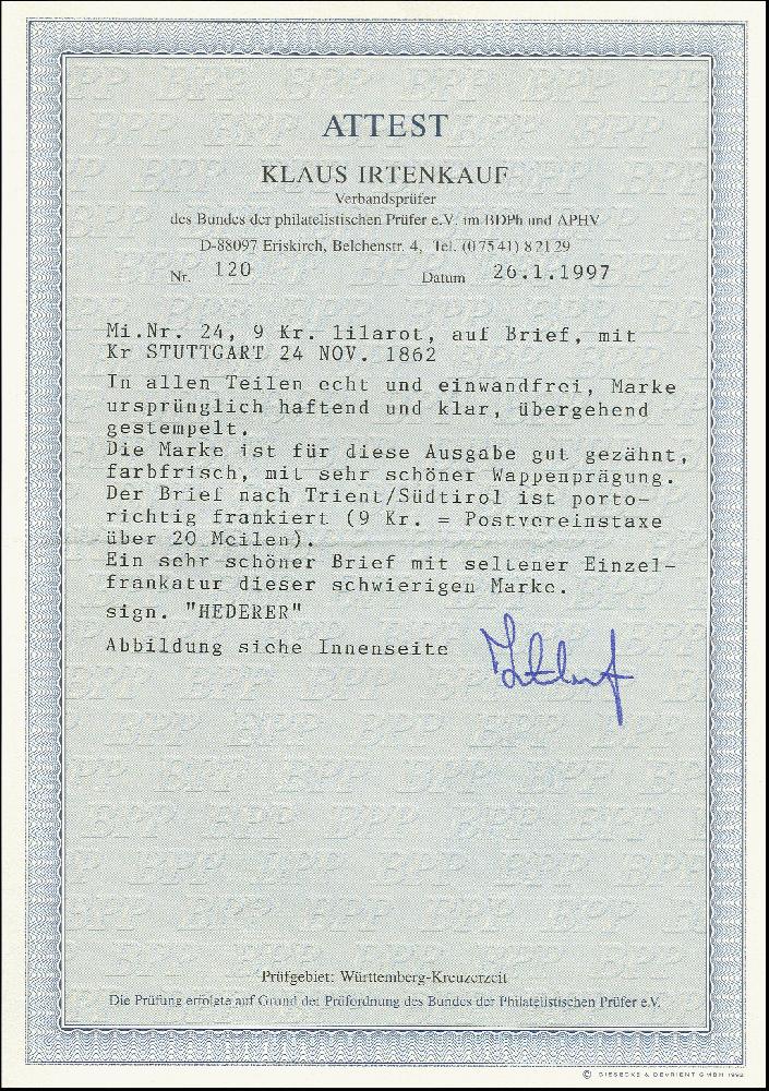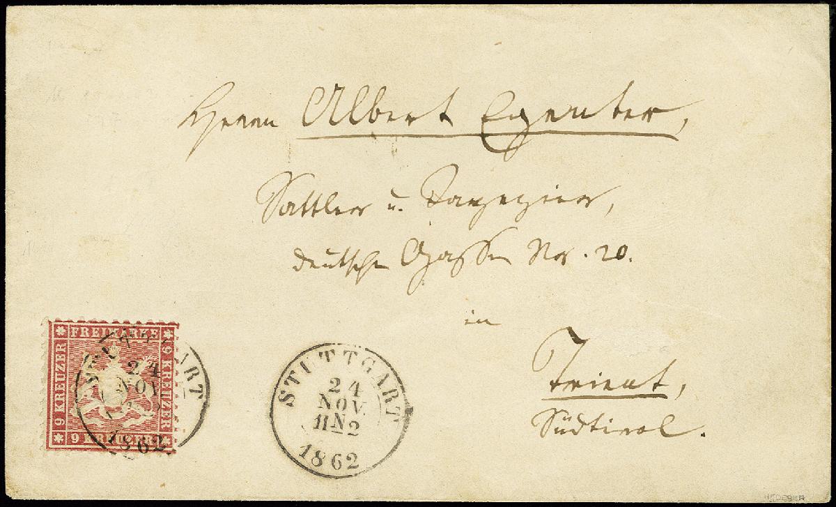 | Zusatzinformationen und Suchstichworte: | 368. Auktion Heinrich Köhler 26.-30. März 2019 Los 3528 9 Kr. lilarot in schöner frischer Nuance, für diese Marke gut gezähnt, mit leicht auf- und nebengesetztem DKr. "STUTTGART 24 NOV. 1862" auf Briefkuvert nach Trient in Südtirol; eine attraktive Einzelfrankatur im Wechselverkehr, sign. Hederer und Fotoattest Irtenkauf BPP (1997) Zuschlag 480,00 EUR |