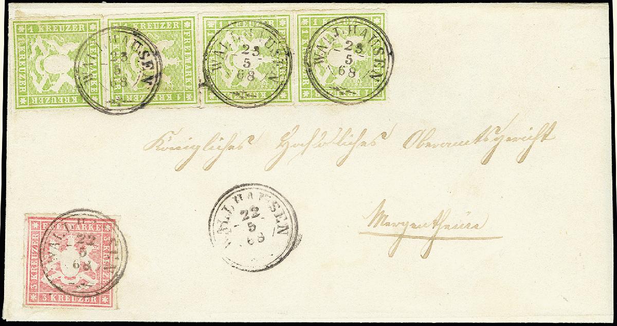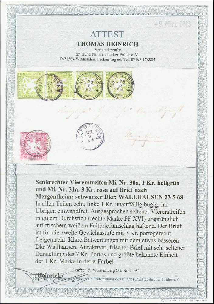 | Zusatzinformationen und Suchstichworte: | 368. Auktion Heinrich Köhler 26.-30. März 2019 Los 3529 1865, Durchstochene Ausgabe 1 Kr. hellgrün im senkrechten 4er-Streifen zusammen mit 3 Kr. rosa, alle farbfrisch und gut durchstochen, die untere 1 Kr. unauffällig bügig, mit Kr. "WALLHAUSEN" vom 22. bzw. 23.5.1868 auf Briefhülle nach Mergentheim; ein attraktiver und seltener Brief mit der größten bekannten gebrauchten Einheit der 1 Kr. hellgrün; Fotoattest Heinrich BPP (2013) Zuschlag 1.900,00 EUR |