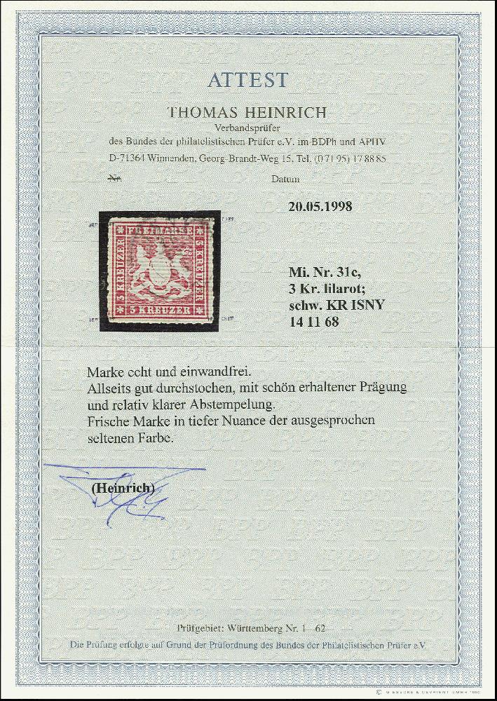 | Prüfer: | Heinrich, Thomas (BPP (Bund Philatelistischer Prüfer)) |