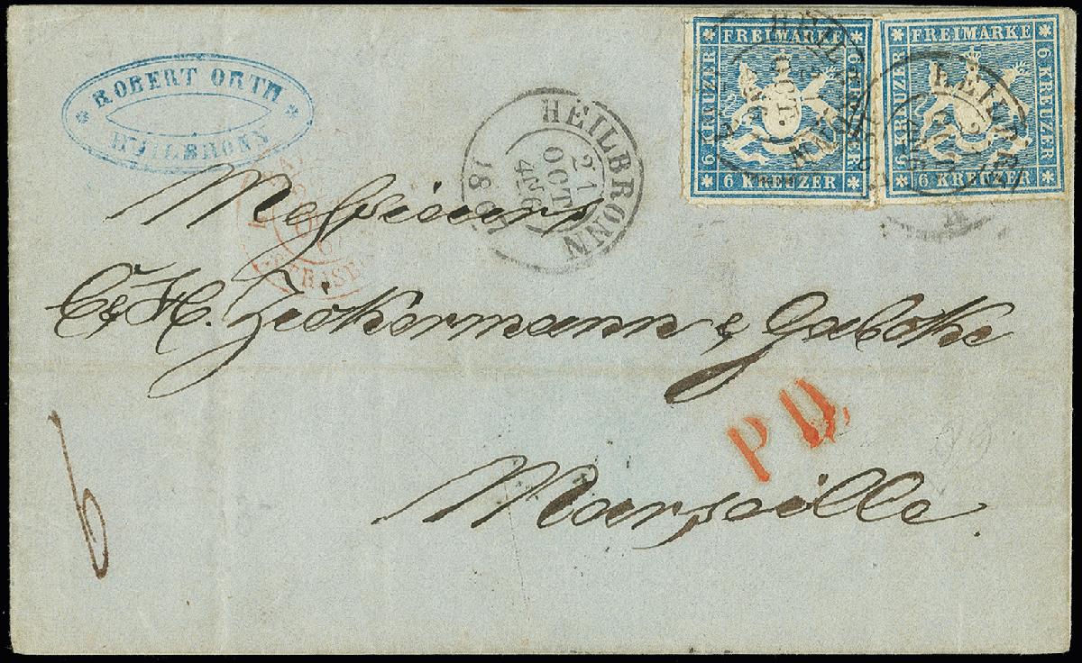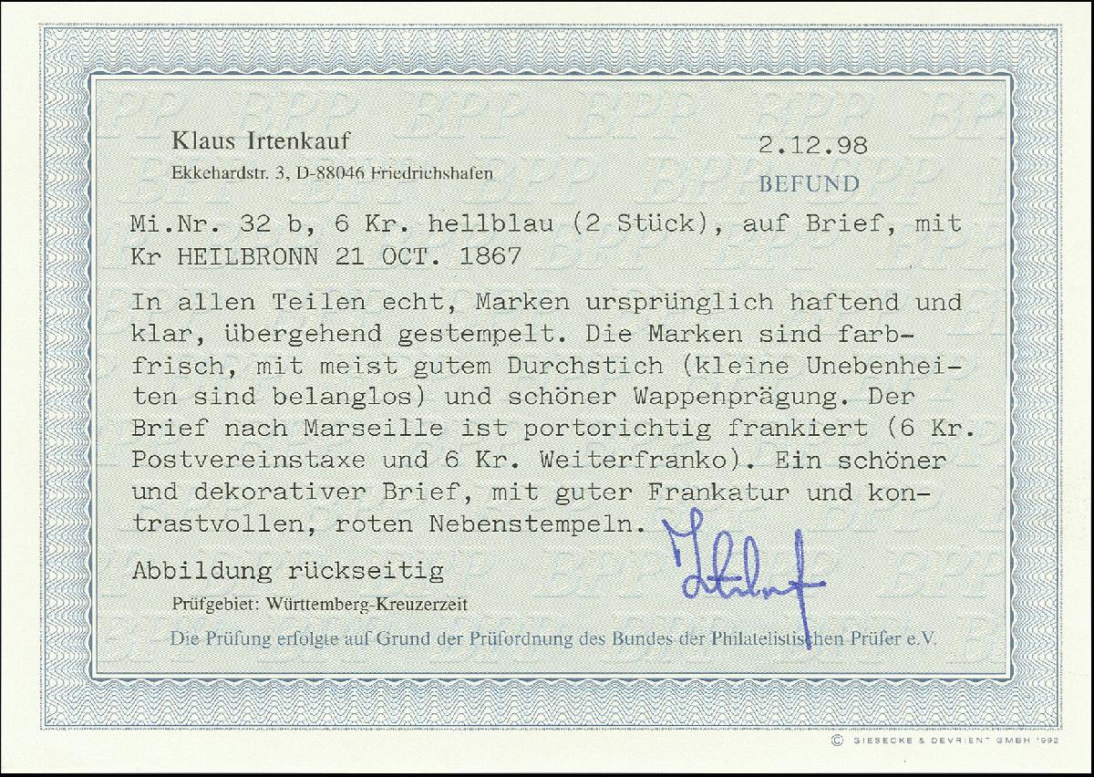 | Zusatzinformationen und Suchstichworte: | 368. Auktion Heinrich Köhler 26.-30. März 2019 Los 3533 6 Kr. hellblau, 2 Einzelwerte mit DKr. "HEILBRONN 21 OCT. 1867" auf Briefhülle nach Marseille, schöne Auslandsfrankatur, Fotobefund Irtenkauf BPP Zuschlag 180,00 EUR |