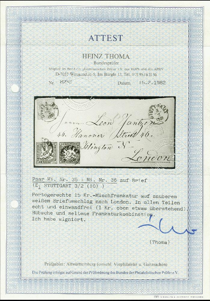 | Zusatzinformationen und Suchstichworte: | 368. Auktion Heinrich Köhler 26.-30. März 2019 Los 3535 1868, 7 Kr. blau im waagerechten Paar, die linke Marke mit markantem Druckausfall, in Mischfrankatur mit Ovalausgabe 1 Kr. grün, alle farbfrisch und gut durchstochen (die 1 Kr. oben etwas überstehend geklebt) mit EKr. "STUTTGART 3/2" (1869) auf Briefkuvert über Frankreich nach England, eine attraktive und seltene 15 Kreuzer-Mischfrankatur, sign. Thoma BPP mit Fotoattest (1982) und Fotoattest Heinrich BPP (2001) Zuschlag 400,00 EUR |