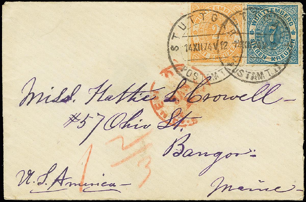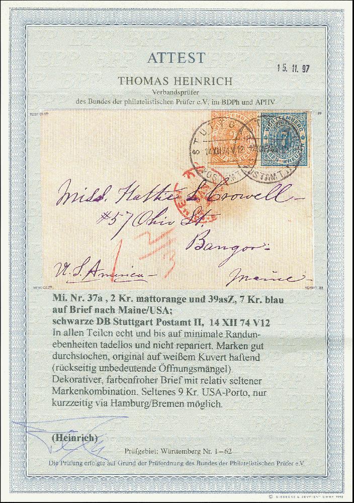 | Zusatzinformationen und Suchstichworte: | 368. Auktion Heinrich Köhler 26.-30. März 2019 Los 3537 2 Kr. orange und 7 Kr. blau, letztere mit schraffierter Wertziffer, beide farbfrisch und bis auf minimale Randunebenheiten tadellos, mit sauberem "STUTTGART 14 XII 74" auf kleinem Briefkuvert nach Bangor, USA, mit vorderseitigem Ankunftsstempel von New York; eine attraktive und recht seltene Frankaturkombination des 9 Kreuzer-Portos über die Hansestädte, Fotoattest Heinrich BPP (1997) Zuschlag 550,00 EUR |