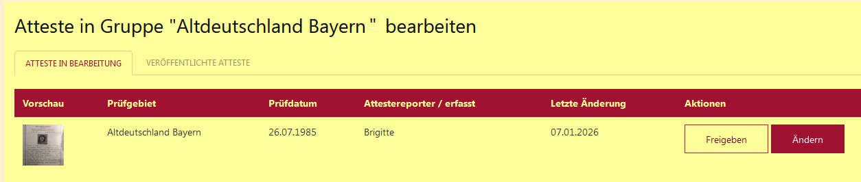 Nachdem Sie ein Attest erfasst haben, müssen Sie es freigeben, damit es für die Redakteure sichtbar wird. Anschließend überprüft ein Attest-Redakteur, ob die Attestabbildung und Ihre Beschreibungen in Ordnung sind. Anschließend wird das Attest von dem Redakteur freigeschaltet und ist dann in der Datenbank sichtbar.