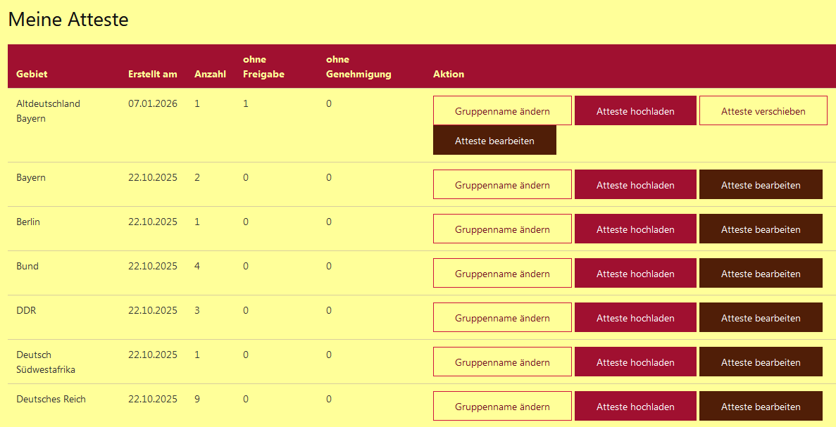 Eine individuelle Zuordnung der Atteste kann innerhalb des Bereiches "Meine Atteste" erfolgen. Dort können unabhängig von der Sortierung in der Datenbank eigene Atteste eingruppiert werden. Ebenfalls hier erfolgt das Hochladen, Bearbeiten, Verschieben und Löschen von Attesten.