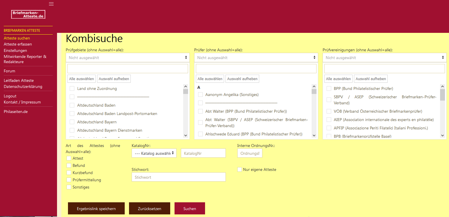 Auf Briefmarken-Atteste.de stehen als Suchfunktionen zur Verfügung: